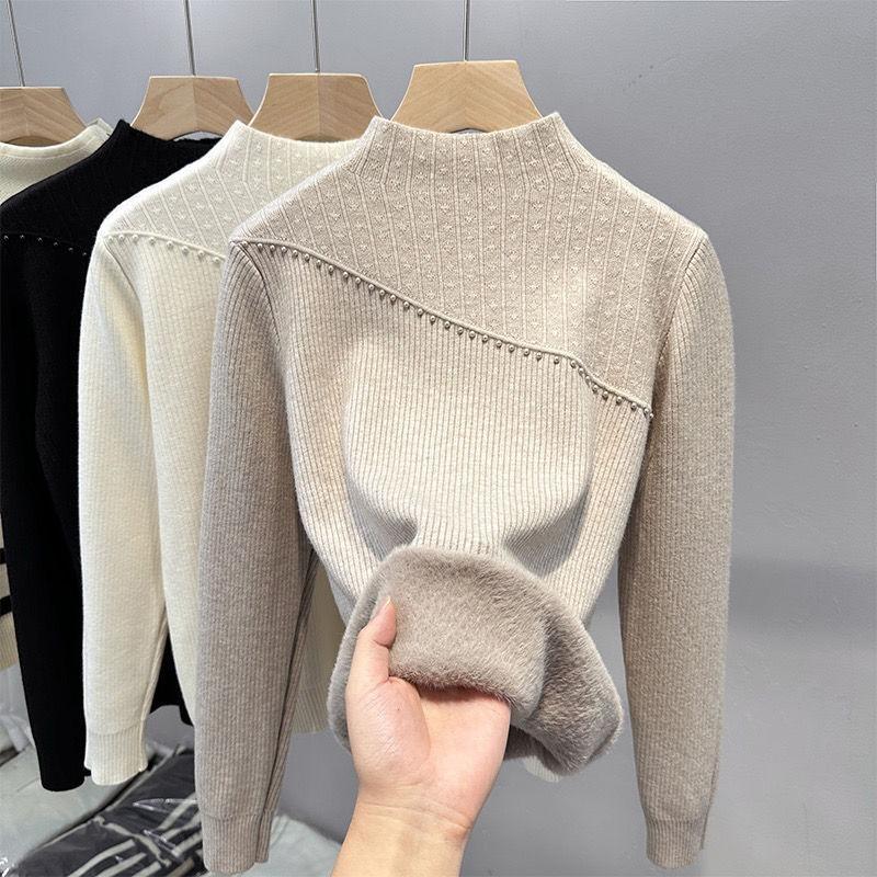 Misc – Autumn and Winter Loose and Thick Woolen Sweater for Women with Integrated Warmth and Velvet Lining Semi High Neck Solid Color Knitted Base Sweater S biały