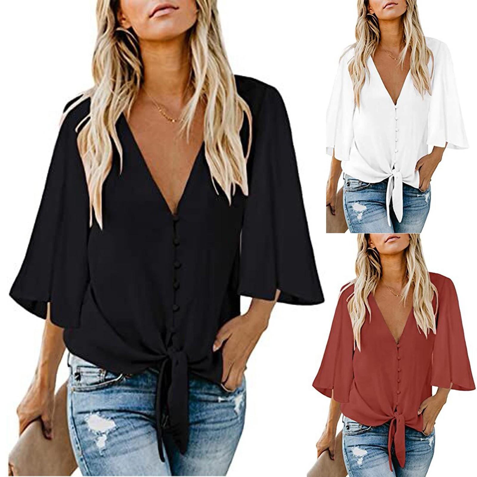 Misc – Damskie letnie bluzki Topy 3/4 Bell Sleeve Tops Jednokolorowa koszula z guzikami XXL biały
