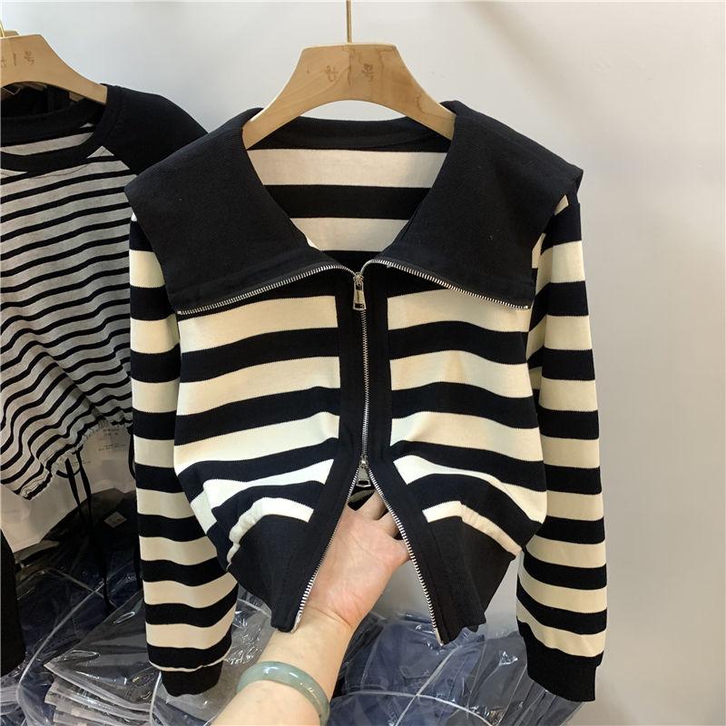 Misc – Lalka Neck Stripe Długi rękaw Krótkie topy Damska wiosenna casualowa odzież wierzchnia Cardigan Design Tshirt M
