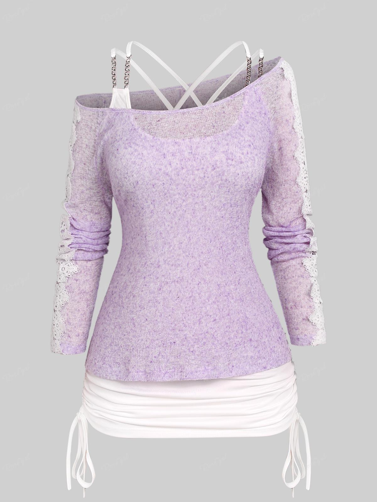 Misc – Rosegal Plus Size Cinched Appliques Lace Chains Crisscross Cold Shoulder Sweater L jasny kolor fioletowy