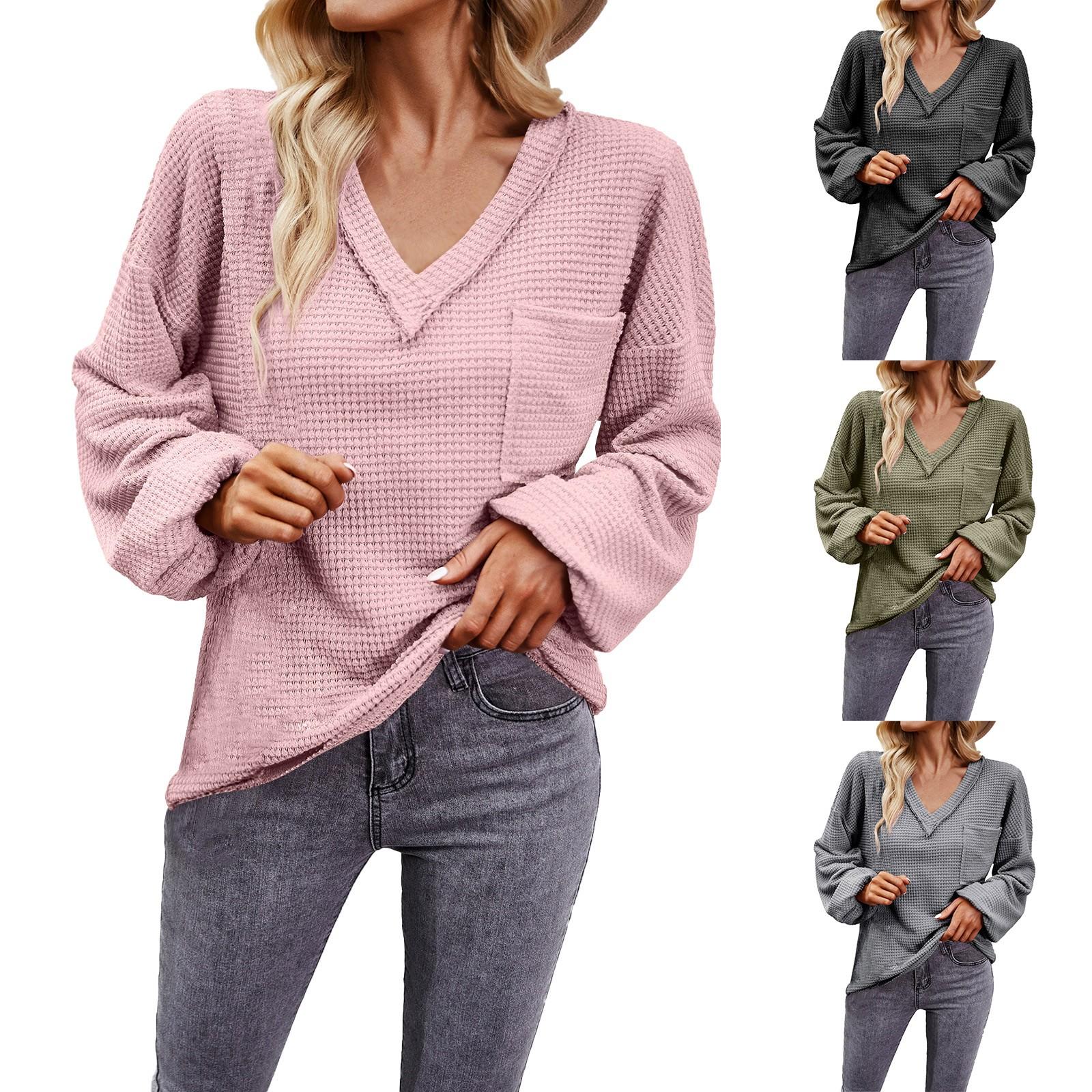 Misc – Sweter damski na jesień i zimę w jednolitym kolorze z długim rękawem i dekoltem w serek L kolor zielono-szary wojskowy