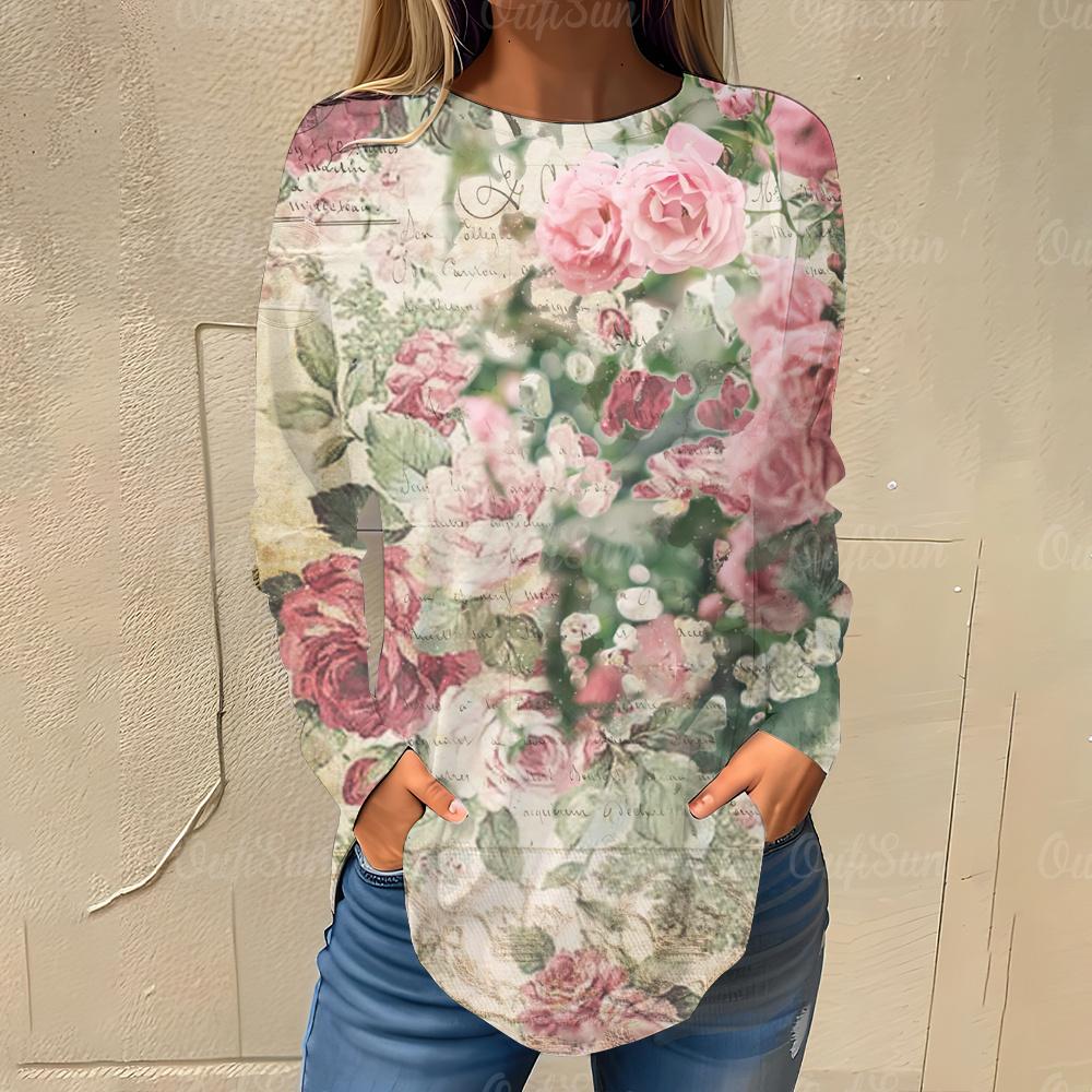 Misc – Vintage damskie koszulki retro kwiatowy nadruk jesień ulica długie rękawy koszulka Y2K odzież damska casual luźne topy sweter S