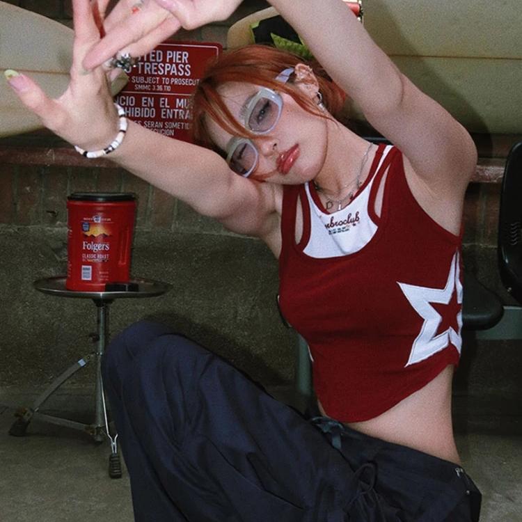 Misc – Vintage seksowna gwiazda nadruk graficzny Tank Top kobiety amerykański Retro Y2k krótkie bluzki Streetwear estetyczny Grunge fałszywe dwa kawałki lato S czerwony