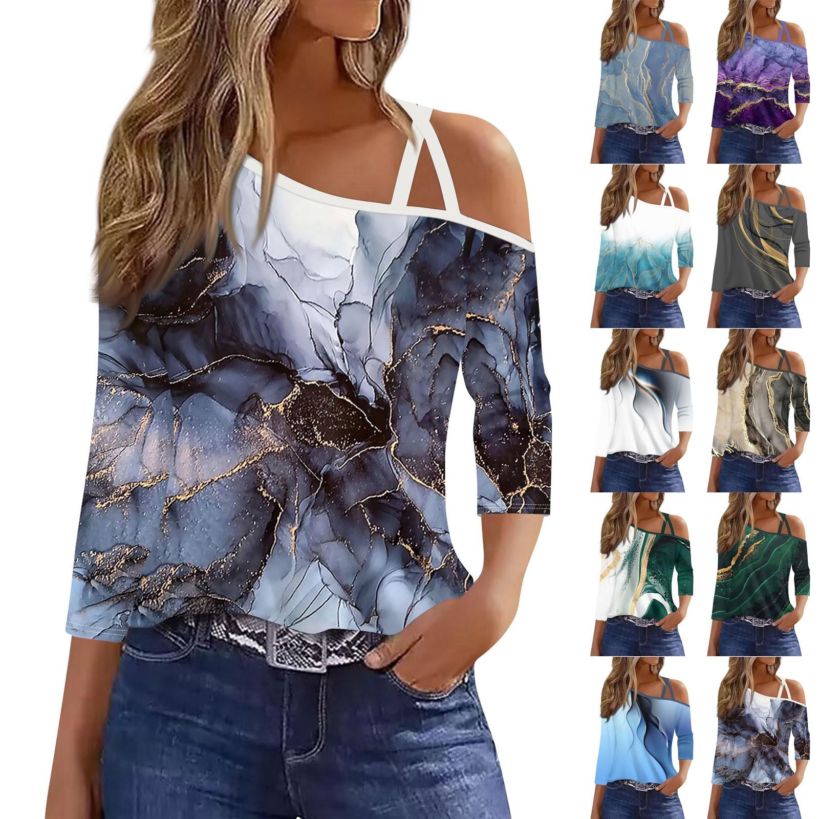Women’s T Shirt Tee Print 3/4 Sleeve Daily Weekend Fashion Basic Cold Shoulder Regular Top M fioletowy
